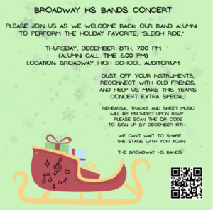 From Danny Holland The BHS Bands have had an outstanding start to their school year. The marching band had a strong competition season, earning high marks and placements at numerous competitions. In addition to strong performances at five competitions and marching assessment, the marching band performed at home football games, the Broadway Homecoming Parade, and John C. Myers Elementary’s November “Walk to School” event. One student was accepted into the South Central Senior Regional Orchestra, eight students were accepted into the 2026 Virginia Tech Honor Band, and fifteen students were accepted into the 25-26 City/County Honor Band. In December, the marching band will be performing at the Broadway Tree Lighting on December 3rd, in the Harrisonburg City Holiday Parade on Saturday, December 6th and the Broadway Firemen’s’ Parade on Sunday, December 14th. The Broadway High School Bands will be performing their winter concert on Thursday, December 18th at 7pm, featuring the Broadway HS Early Bird Jazz Ensemble, Concert Band, Wind Ensemble, and Marching Band! Thank you to all of the faculty, families, sponsors, and community members who have and continue to support the bands at Broadway High School.