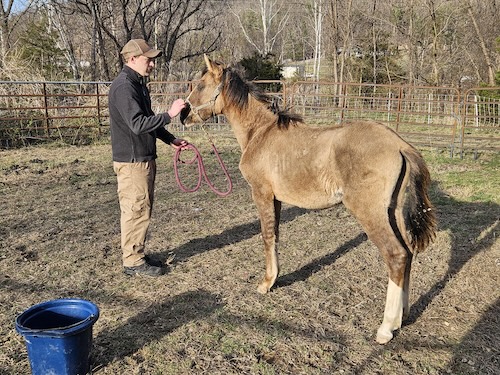 Joey Van Orden is in the Whippersnapper Division with baby Triscuit. Triscuit is already at the Van Orden’s farm, a gorgeous and gaited Rocky Mountain grullo with a dorsal stripe and stripes on his legs. He is one of many babies who ended up being rescued. Usually, the babies go to trainers through a random draw, but since there were so many this year, trainers got to pick, if they took theirs early. Triscuit was the one Joey wanted. He needs socialization but was making progress in just a few days. Triscuit’s mother, Twinkie, is also in the program with another trainer. Triscuit is on ulcer medicine, having gotten sick during the move from Kentucky to the Phoenix Rescue in WV. His paddock companion and “babysitter” here at Pale Hollow Farm is the Van Orden resident pony, Dozer. Dozer takes the job very seriously, teaching the baby manners and boundaries. Mr. Mom Dozer helps smooth the transition for Triscuit, who left his mom, and is experiencing a whole new world here in Fulks Run. His schooling has already begun. Joey had a baby, Sprocket, in last year’s competition, and did very well with him.