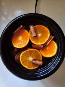 At my library, we have a broken book cart in the break room that serves as a “free to a good home” spot where folks can offload their former treasures and find new ones as well. One fateful morning, I found a mini crock pot that is typically used to keep dip warm for parties. Not having a wood stove and being wary of having my gas stove on for hours at a time, I grabbed the little guy up and took it home, and immediately adopted it as my simmer pot.