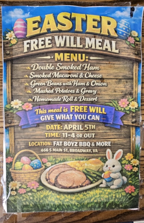 “You give what you can give, if you can. We set a bucket on the counter and give what you can. From the Thanksgiving meal, we donate back to the local schools for Christmas. We were able to donate around $2,000 to 5 or 6 area schools. We do all the local elementary, and the middle school.  The middle school kitchen donates all the rolls for the Free Will meals- 19 or 20 dozen for Thanksgiving, and for Easter as well.”