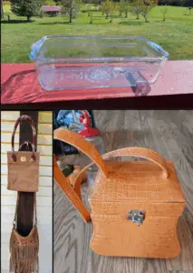 An unusual and very bright orange purse caught Pat’s eye, which turned out to be a jewelry travel case, in perfect condition! Purses were the thing that day apparently, because she scored a corduroy Longaberger purse, and a vintage boho hippie leather fringe cross body bag!